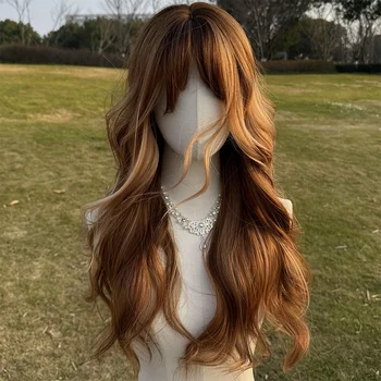 26-inch Reddish-brown Highlights Wave Wig Women's Bangs-heat-resistant Synthetic Hair, Long Flowing Style Sm412
